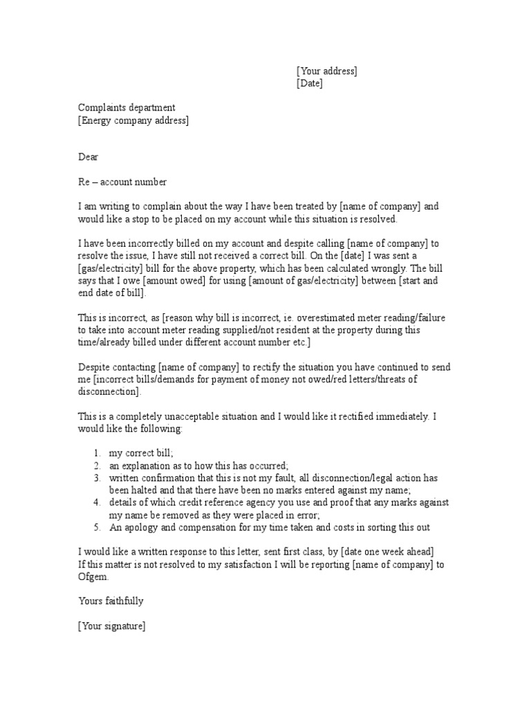 Energy Company Complaint Letter
